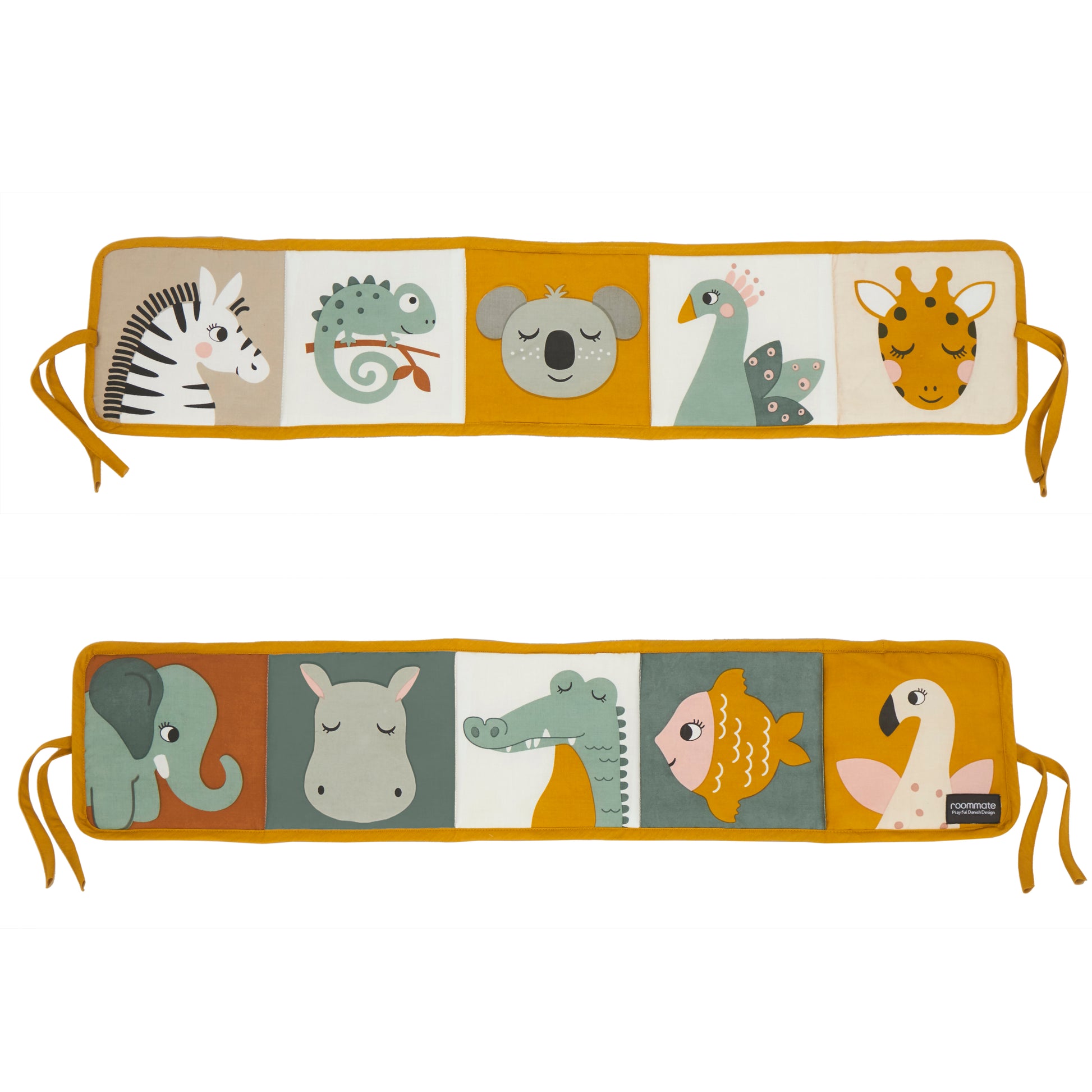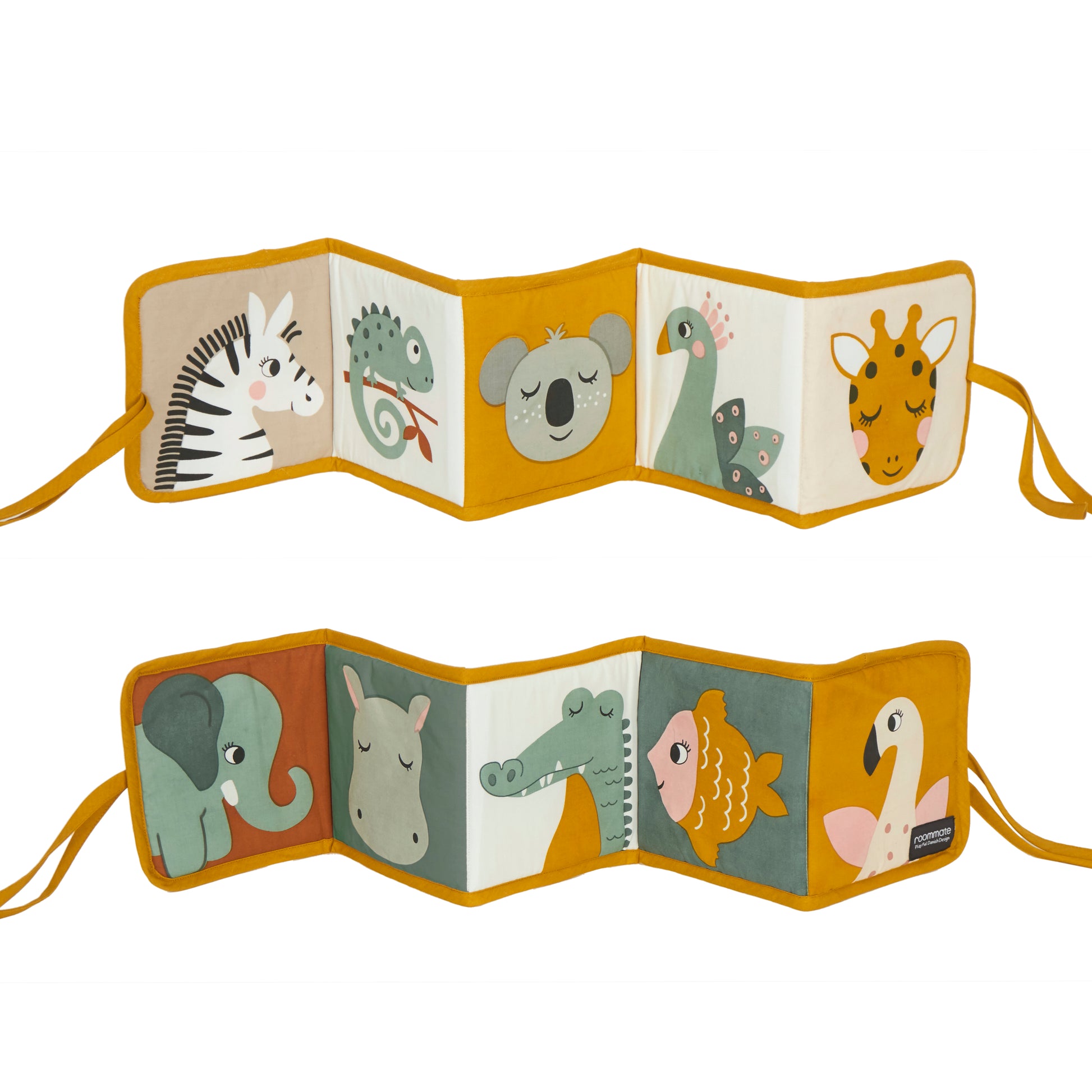 Soft fold out baby book. Tie on crib rail or use in pram.